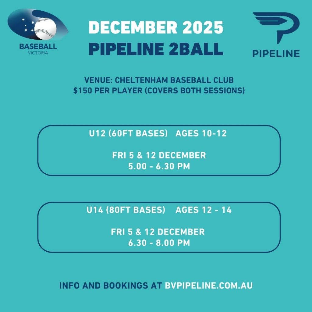 BV Pipeline What is Pipeline?The BV Pipeline includes programs for players of all levels to foster fun, development & performance. Our programs include:Performance Pathway2BallHoliday campsOur Goals:Ignite passion & love of baseballDevelop skills that scalePrepare players to perform in competition Share knowledge & support the Victorian coaching community Pipeline Programs Performance Pathway Learn more about our Performance Pathway Click here 2Ball View & book our upcoming 2Ball programs Click here Holiday Camps View & book our upcoming Camps Click here See our Coaching Resources page Coach HQ Follow our Instagram page @bvpipeline Lessons School holiday lessons being released soon Click here